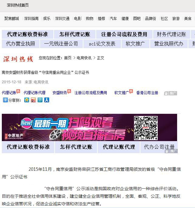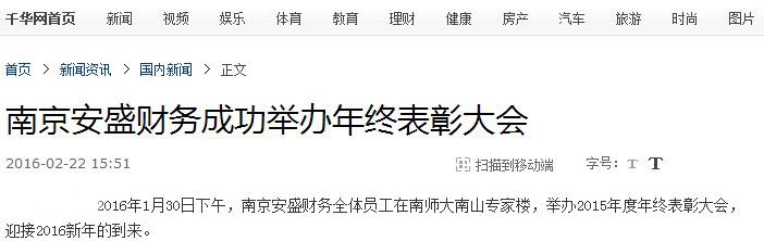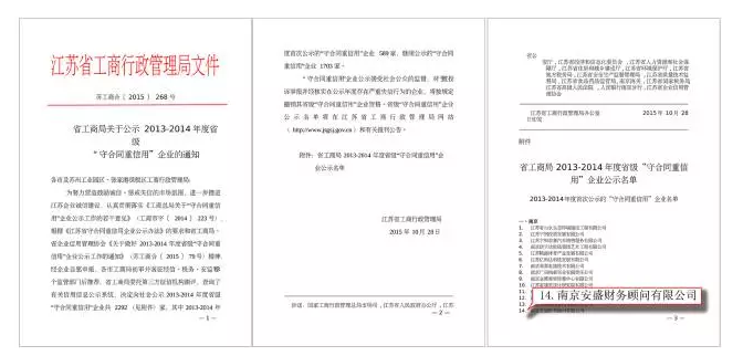 2015年11月,南京安盛財務(wù)榮獲江蘇省工商行政管理局頒發(fā)的省級“守合同重信用”公示證書