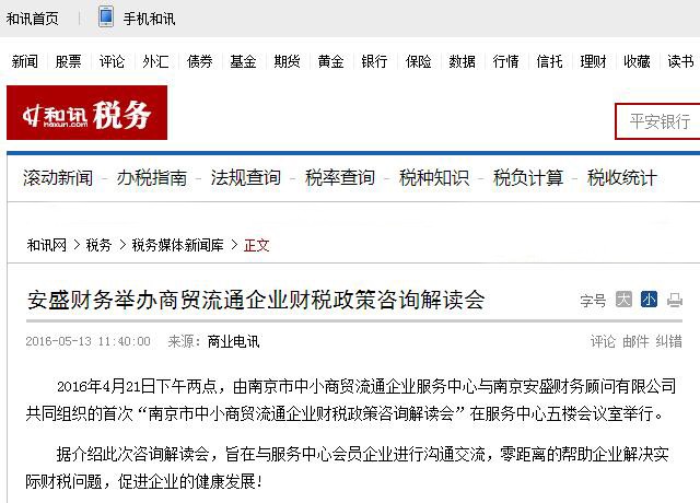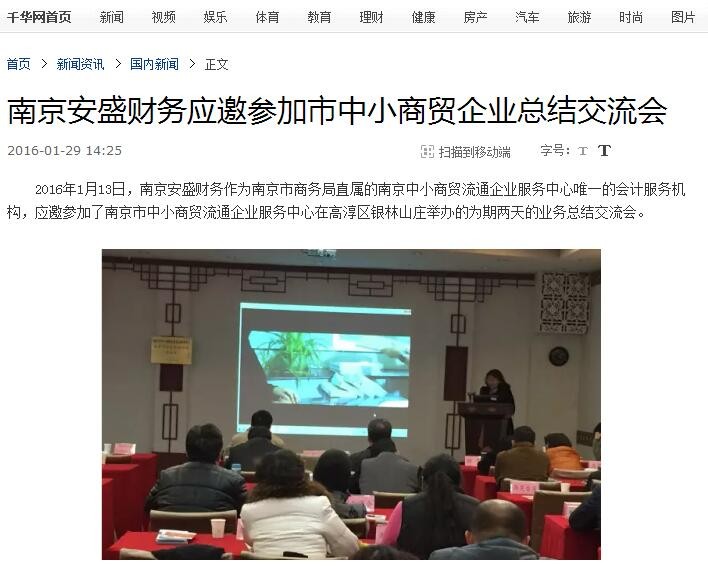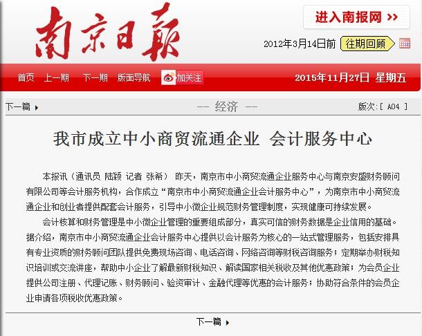 2016年1月13日,南京安盛財務(wù)作為南京市商務(wù)局直屬的南京中小商貿(mào)流通企業(yè)服務(wù)中心唯一的會計服務(wù)機構(gòu)。